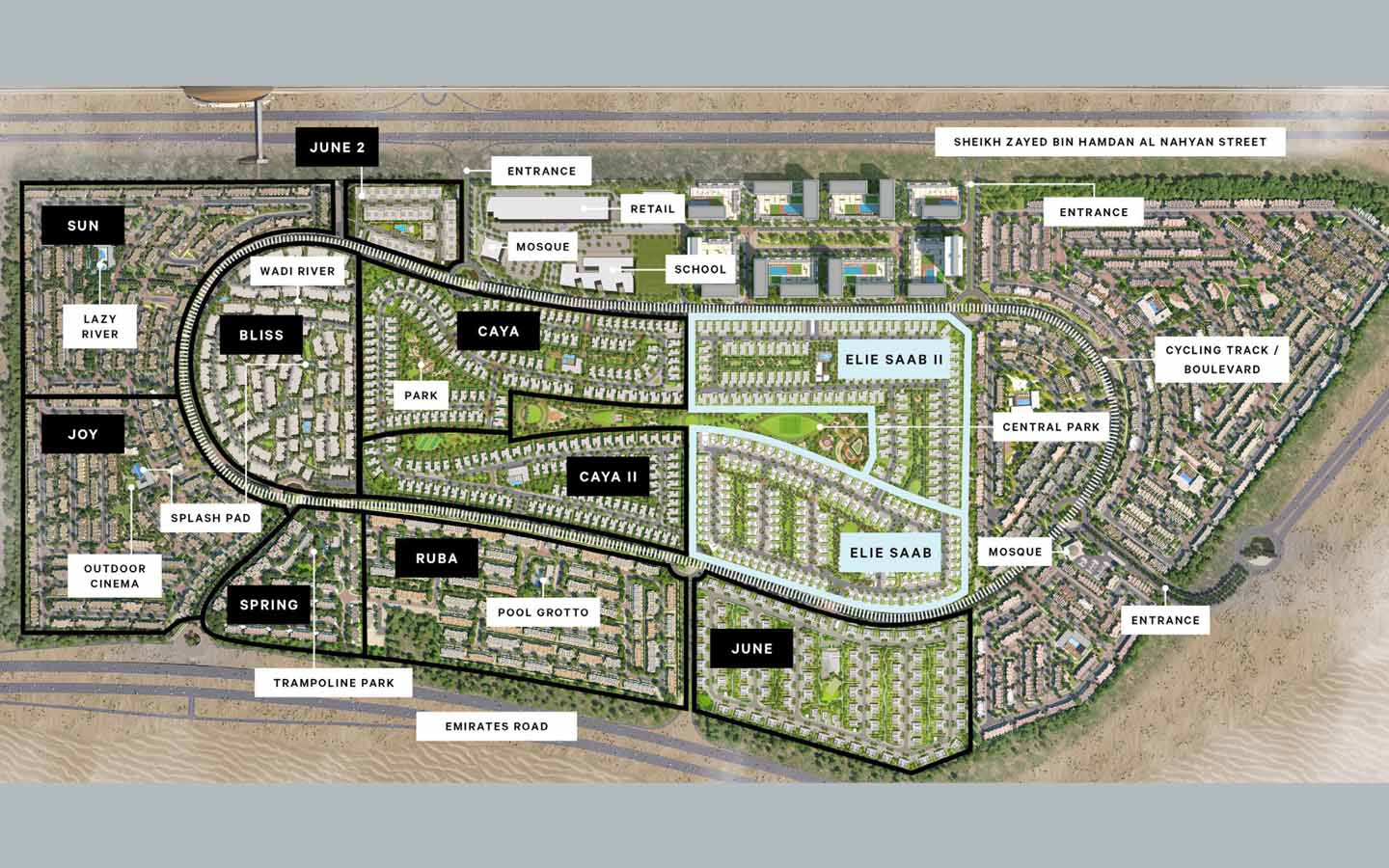 يعرض المخطط الرئيسي مدخلاً رئيسياً وبركة سباحة مع لاونج للاسترخاء والتشميس وبركة سباحة أخرى للأطفال، إلى جانب مناطق لعب للأطفال ونادي اجتماعي وساحة اجتماعية ومساحة عشبية واسعة ومسارات للركض وساحة شواء ريفية، بالإضافة إلى مدخل ومساحة عشبية مثالية للتجمعات والجلسات الاجتماعية.