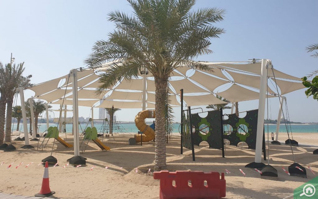 فيما يتعلق بالمواصلات العامة، يستطيع السكان وزوار المنطقة ارتياد الحافلات من عدد من المحطات القريبة، مثل محطة حافلات فندق قصر الإمارات/شارع الكورنيش التي تمر منها الحافلات رقم 009 و 034 و 069، بينما تصطف الحافلة رقم 034 في موقف حافلات أبراج الاتحاد، أما موقف حافلات فندق باب القصر فيخدم حافلة ياس إكسبرس الخط الوردي، كما يمكن للسكان التنقل بسيارات الأجرة المتوفرة بكثرة في المنطقة.