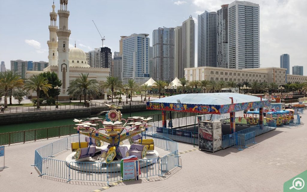 توفر المنطقة سهولة الوصول إلى أشهر الوجهات الترفيهية في القصباء الشارقة المناسبة للأطفال والكبار على حدٍ سواء، ومن أشهرها منطقة بيت المرح للأطفال، وهي منطقة لعب ذات طابع مائي مخصصة للأطفال وتوفر العديد من الألعاب، مثل المنزلقات وألعاب الكرات وإطارات التسلق وألعاب الحواجز.