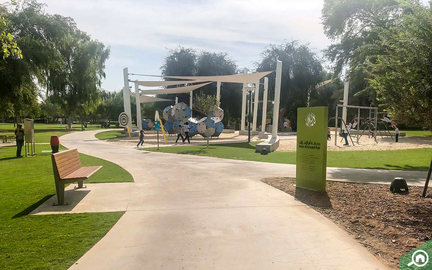 أما في بيت الظل، فيمكن للزوار التمتع بالمناظر الطبيعية والأشجار المختلفة داخل منطقة مظللة ومريحة، حيث يتوفر أكثر من 30 نوعاً من الأشجار داخل الحديقة، وبالنسبة للمدرج، فقد تم تخصيصه لإقامة النشاطات الخارجية والحفلات، أما حديقة الأطفال، فهي منطقة مخصصة للاستمتاع بالطبيعة بكل حرية وأمان. من الجدير بالذكر أن حديقة أم الإمارات حائزة على جائزة العلم الأخضر البيئية المتعلقة بالنظافة والجودة والأمان.