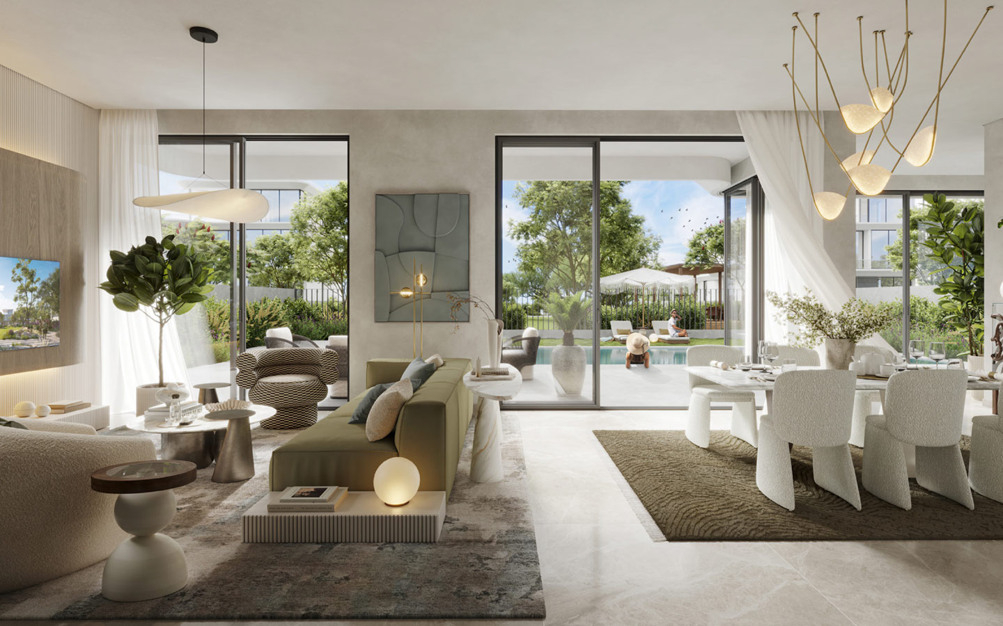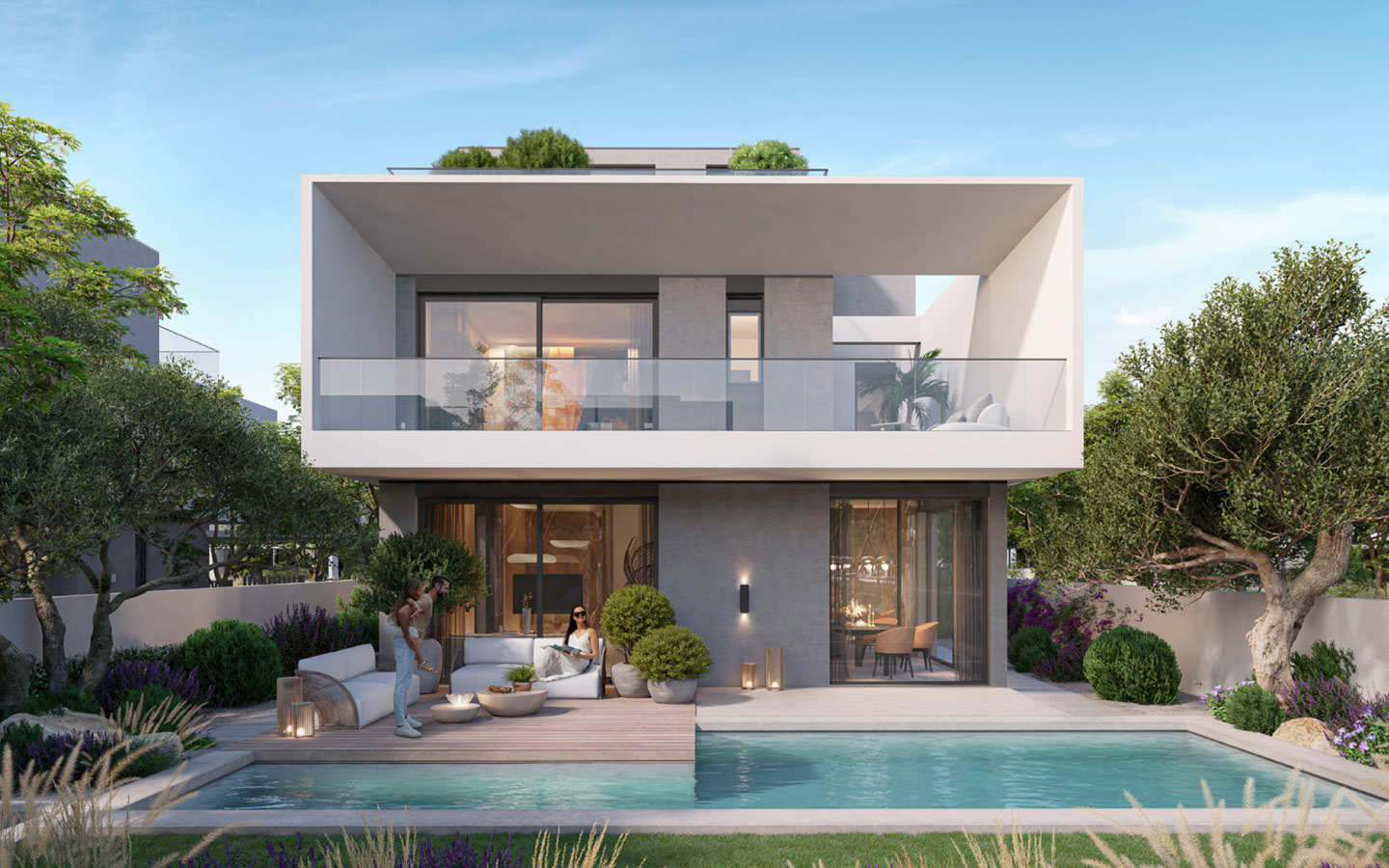 تتألف الفلل من 3 طوابق، وتشتمل على غرف معيشة واسعة ومطابخ مجهزة بالكامل وغرفة للضيوف وغرفة للخادمة. يضم الطابق الأول غرف رئيسية وغرفة للعائلة، وتشتمل الغرف الرئيسية على حمامات ملحقة وخزائن حائط، أما الطابق العلوي، فإنه يتضمن شرفات على السطح وغرفة للعائلة يمكن استخدامها لعدة أغراض، هذا وتتضمن الفلل حدائق طبيعية خضراء ومواقف للسيارات.