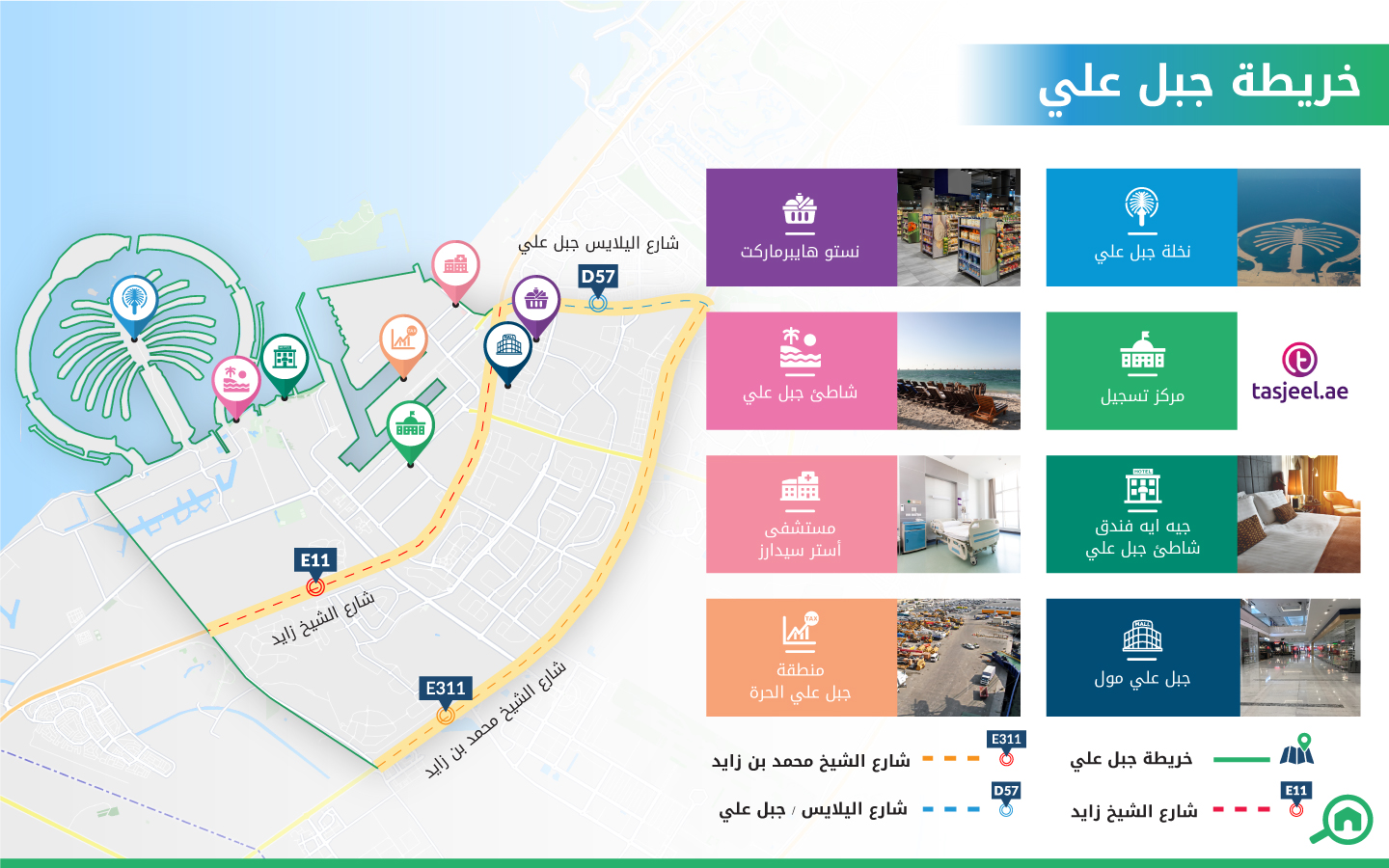 يسهل الوصول إلى العقارات التجارية في المنطقة؛ نظراً لوقوعها على مقربة من الطرق السريعة الرئيسية في دولة الإمارات العربية المتحدة، بما في ذلك شارع الشيخ محمد بن زايد E311 وشارع الشيخ زايد E11، ما يجعل منطقة جبل علي تصنف ضمن أفضل المناطق لشراء العقارات التجارية في دبي، بما في ذلك المكاتب والمستودعات ومساكن العمال التي يمكن شراؤها وفقاً للأسعار الآتية: