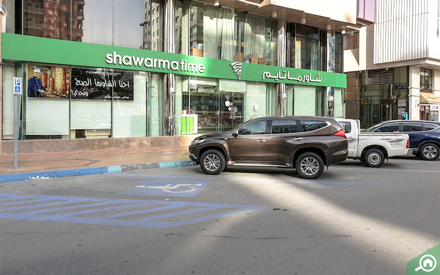 يستطيع الزوار والمقيمون في شارع النجدة الاستفادة من مواقف السيارات العامة المتاحة بالأجرة التي تنتشر في جميع أنحاء المنطقة، إلى جانب ذلك، تتضمن كل فيلا في المنطقة موقف سيارات يتسع لسيارتين في ذات الوقت، كما يتم تخصيص مساحة لوقوف السيارات لأصحاب الشقق السكنية.