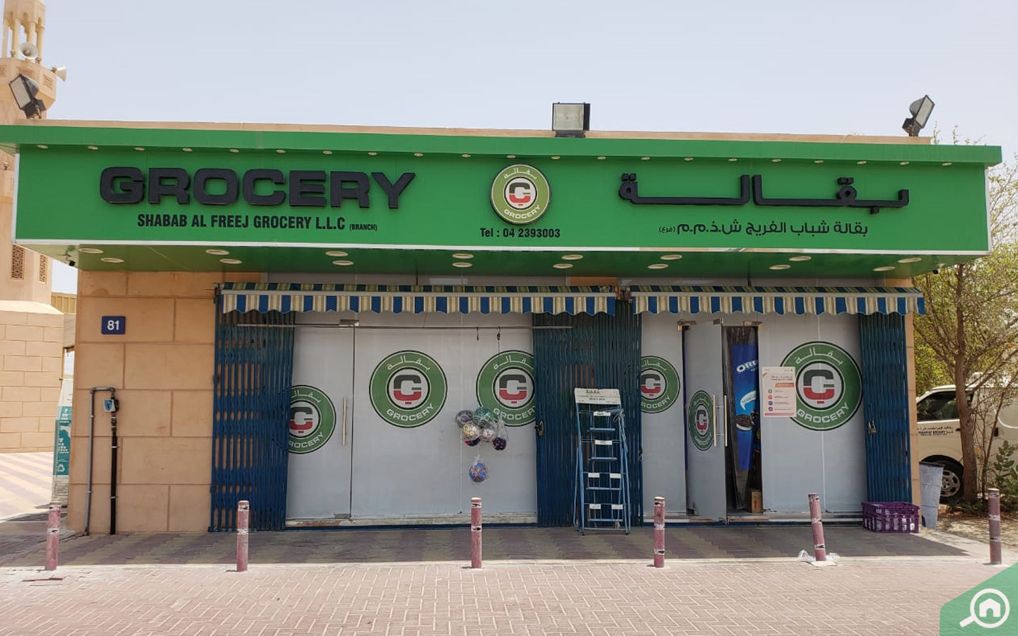 يستطيع سكان المجمع السكني شراء مواد البقالة من عدة محلات سوبر ماركت، بما في ذلك بقالة الملاس وبقالة شباب الفريج الواقعتان داخل المجمع.