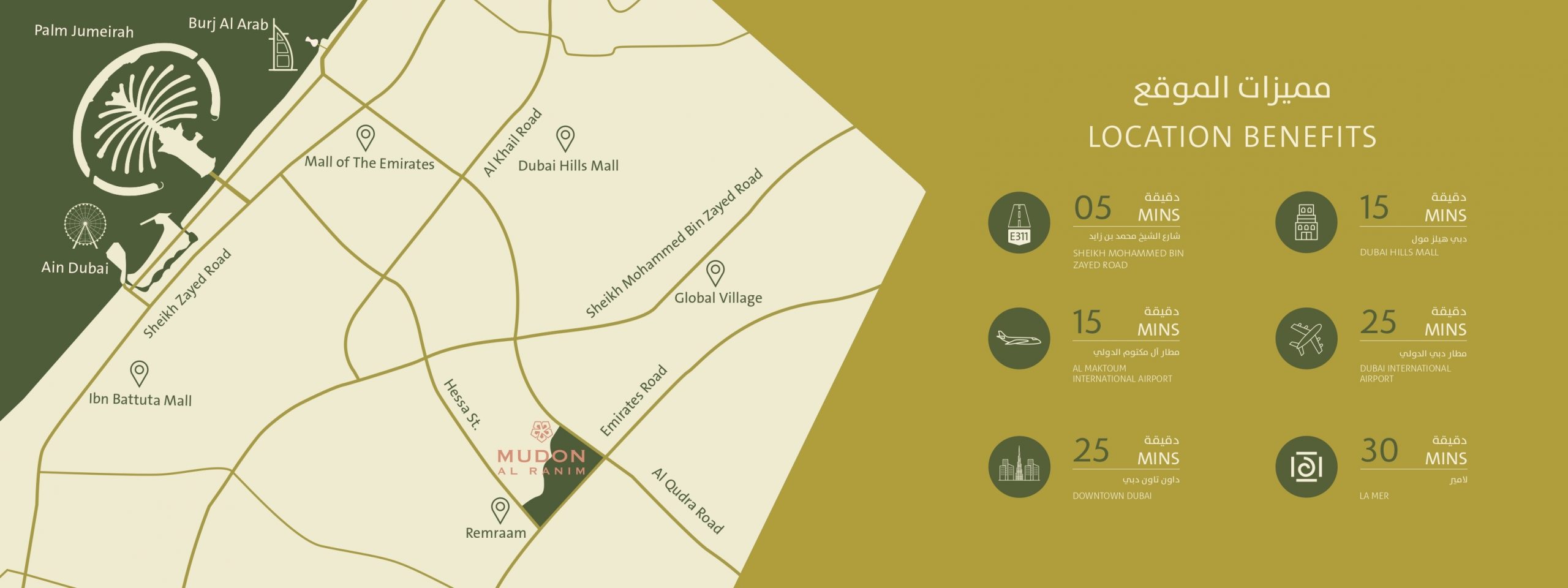 مدن الرنيم دبي هو جزءاً من مشروع مدن الرئيسي، وتُحيط به المساحات والحدائق الطبيعية الخضراء والمسارات المرصوفة.