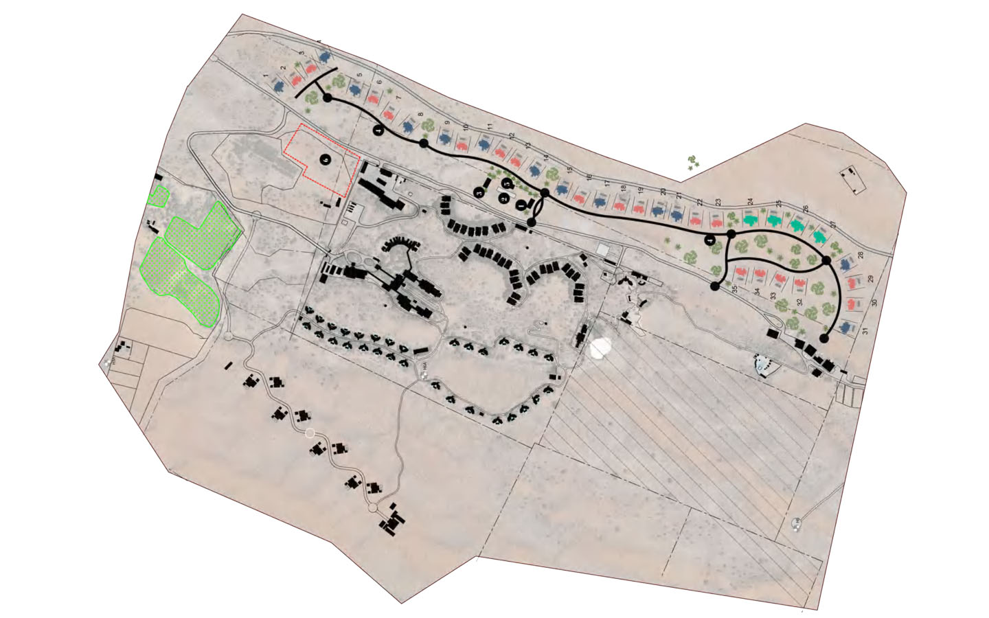 يعرض المخطط الرئيسي للمشروع وحدات سكنية ومرافق تمتد على مساحة 500 قدم مربع، حيث يتوفر نادي مجتمعي وحديقة ومواقف للسيارات ومسار مرصوف ومدخل مباشر يربط كل فيلا مع المنتجع.