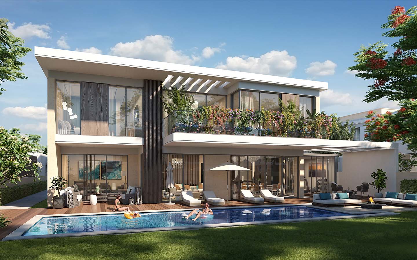 تشمل كل وحدة عادةً غرفة ضيوف ومطبخ مجهز وغرفة خادمة وغرفة غسيل ملابس، إلى جانب مساحة معيشة وطعام بتصميم مفتوح تطلّ على مسبح وحديقة خاصة، كما تضم جميع الفلل مواقف لثلاث سيارات وشرفة ومساحة تخزين.