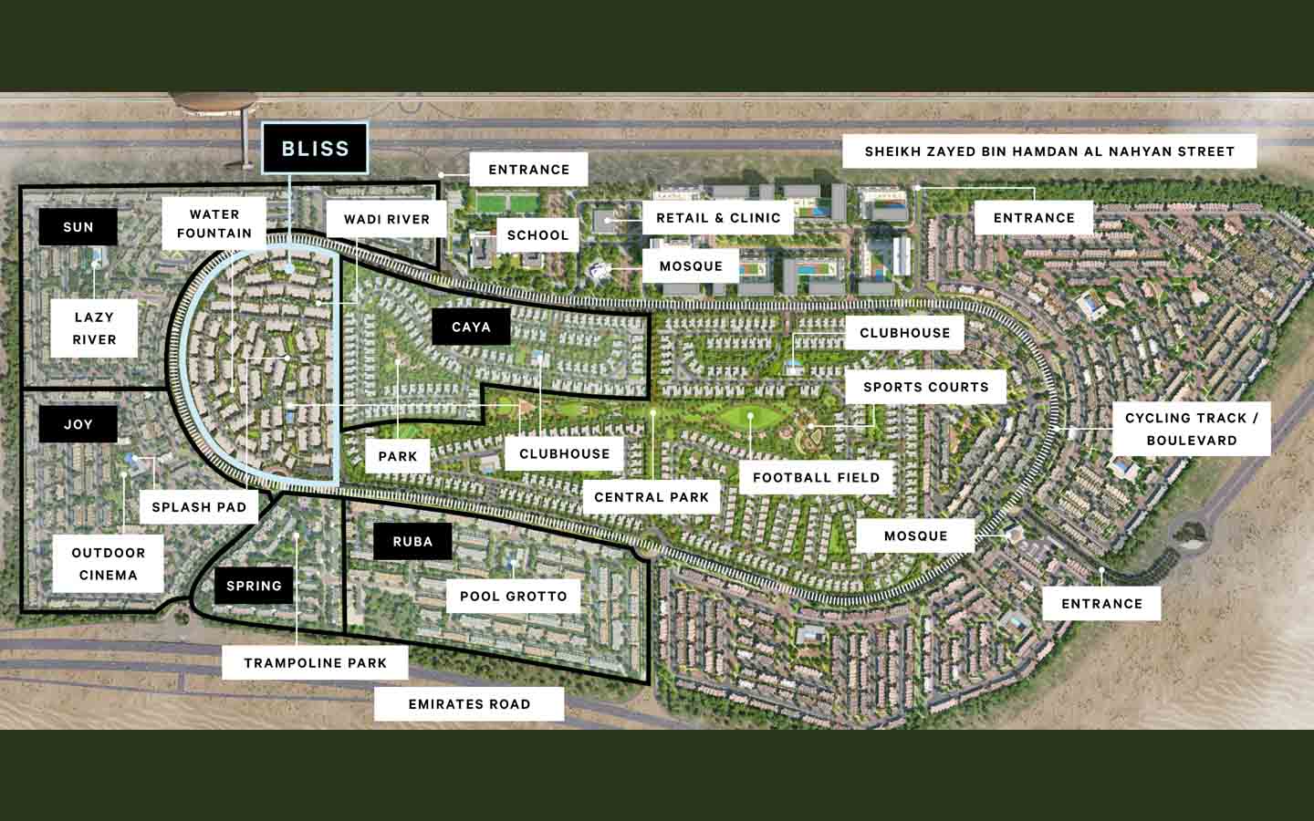 Bliss is home to a town centre, a clubhouse and a mosque. In terms of recreational facilities, residents have a fully equipped gym and a community pool in the neighbourhood. The highlight of the project is the Wadi River, where kids and adults can spend quality time together. Other features include a fountain square and barbecue areas.