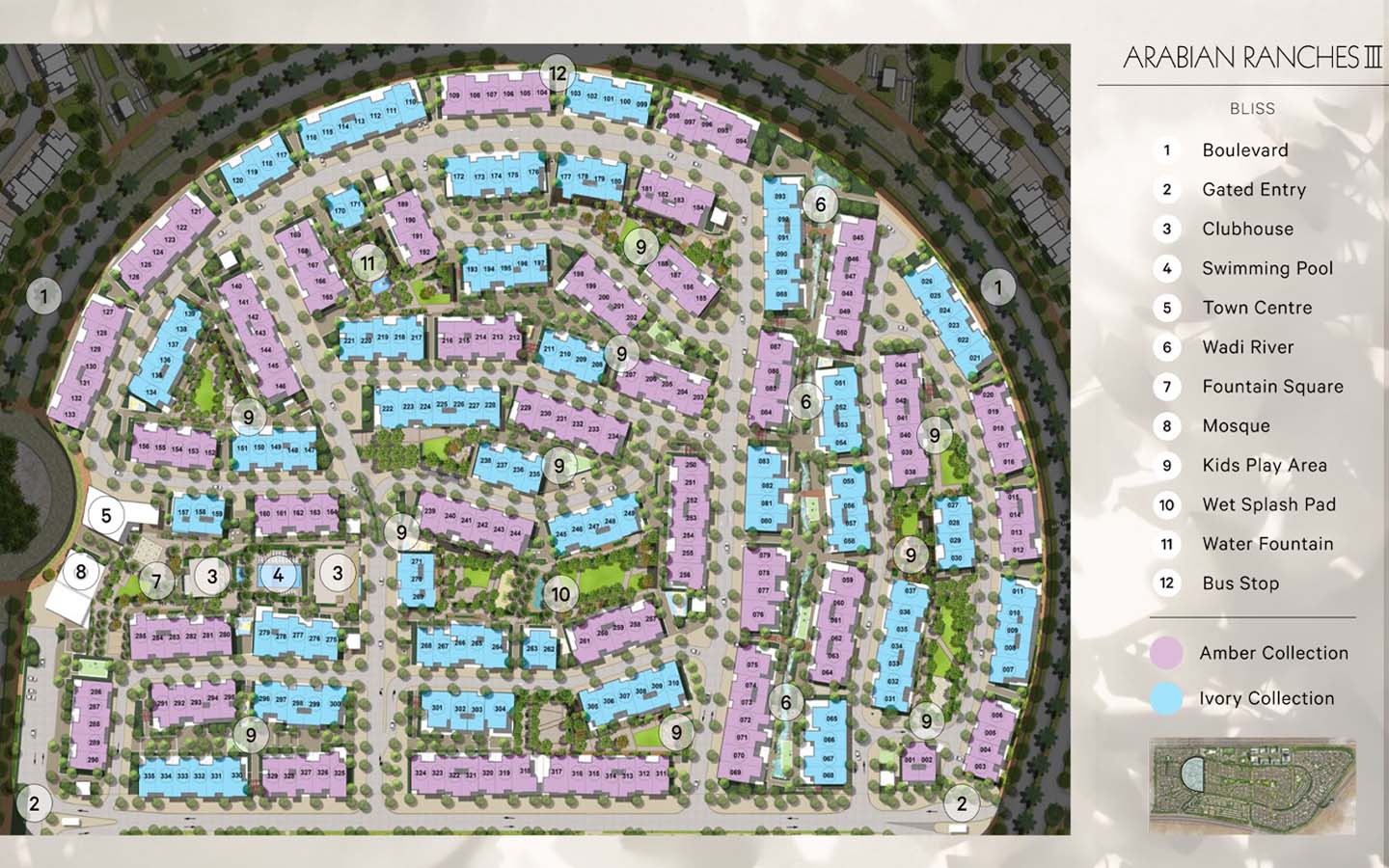 Properties include duplex and triplex 3-bedroom and 4-bedroom houses for sale in Bliss Arabian Ranches 3 Dubai. These residential units are offered in two different architectural styles: Amber Collection and Ivory Collection.
