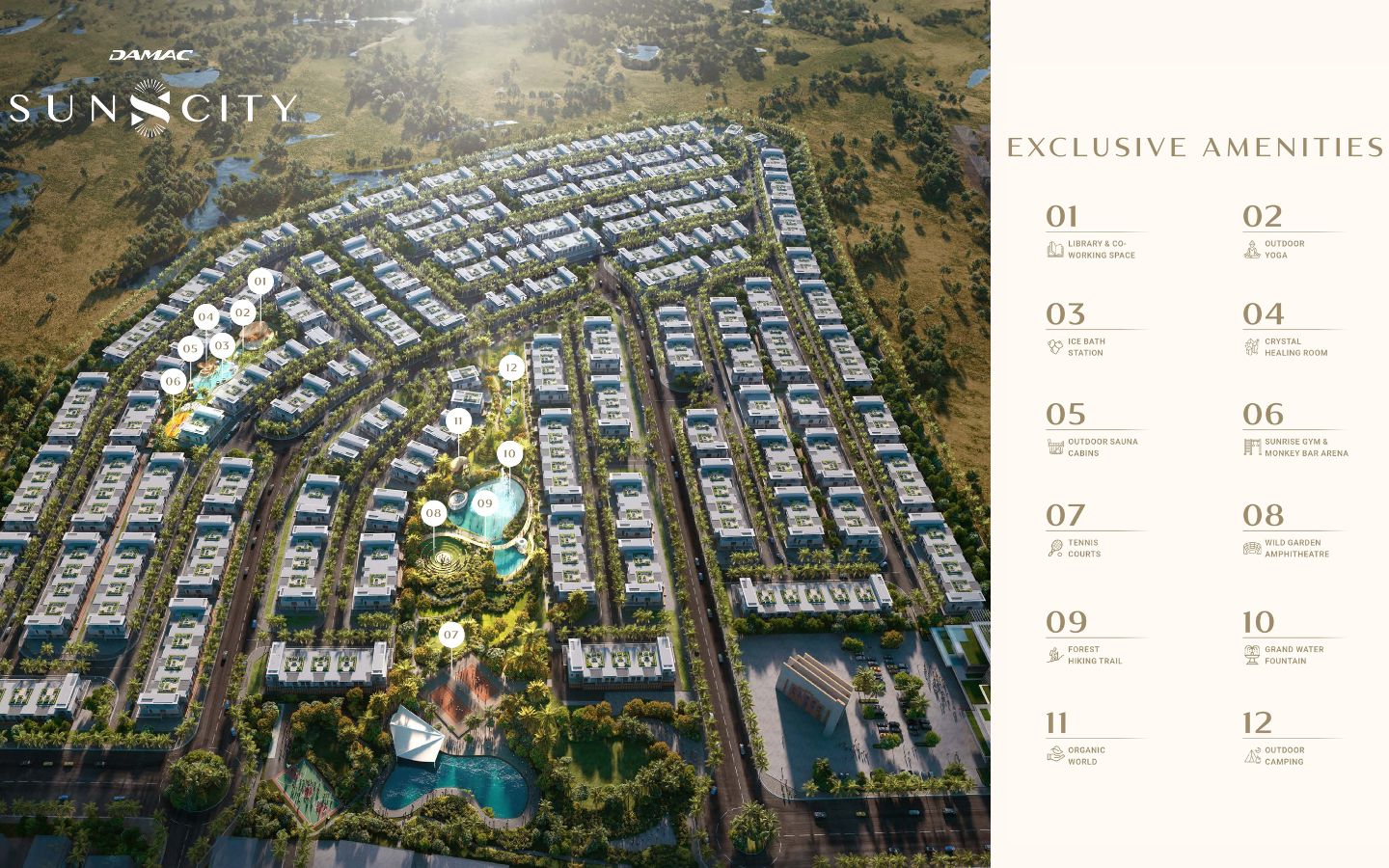 The masterplan of DAMAC Sun City includes beautifully crafted homes, lush landscapes, wellness-focused spaces and calm zones.