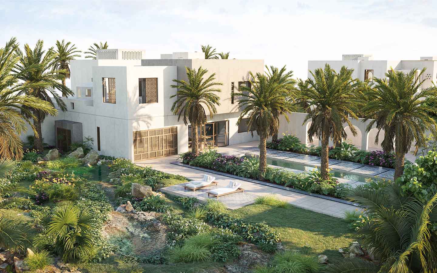 Joud Villas is inspired by traditional Arabic construction. These residential units reinterpret the majlis, courtyards and maqa’ad of the past to create warm and welcoming family spaces. Also, Joud Villas Al Jurf Gardens feature multiple textures, water features and land levels complementing the natural landscapes of the community.