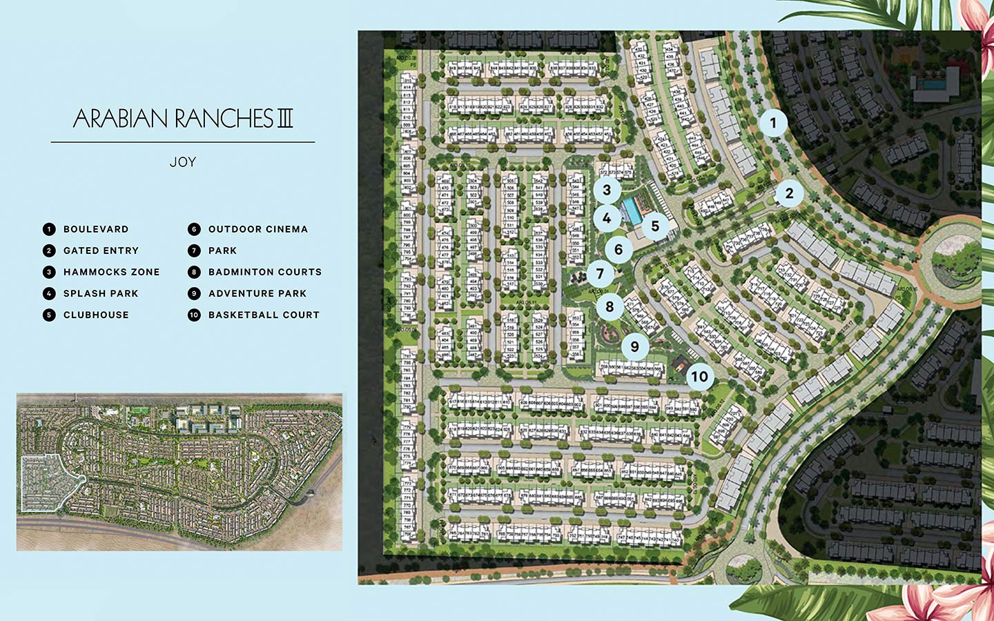 Being a part of Arabian Ranches 3, there are many townhouses and villa sub-communities near Joy, such as Spring, Sun, Bliss and Caya. When moving outside of Arabian Ranches 3, there is Dubailand in the East, the City of Arabia in the Northeast and Dubai Lifestyle City and Arabian Ranches in the West.