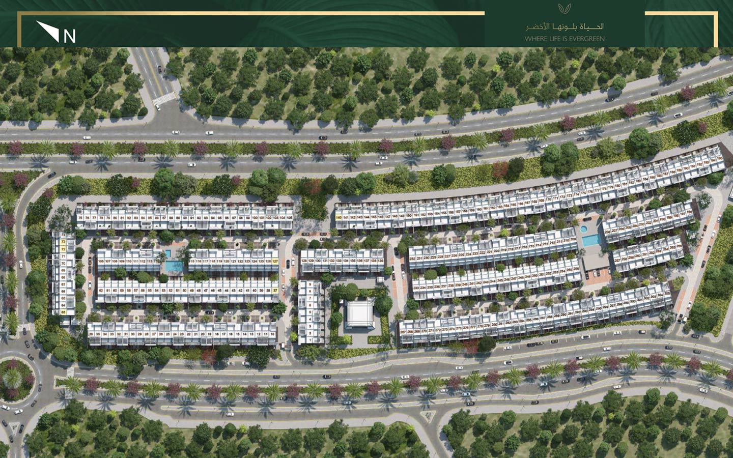 Verdana Dubai Investments Park features 305 luxurious townhouses in 4-bedroom configurations. Each unit spans 2,772 sq. ft. to 3,394 sq. ft. and has a total height of 13.60 metres.