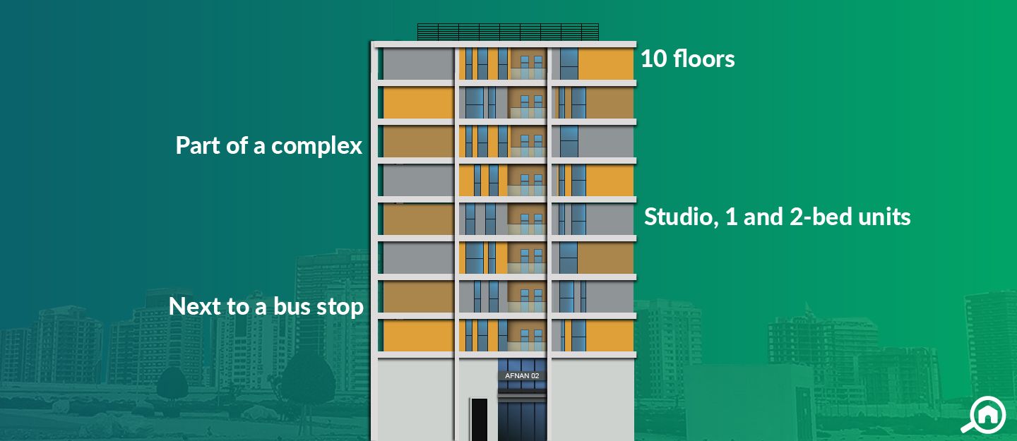 Apartment types in Afnan 2 include studio, 1-bedroom and 2-bedroom apartments.