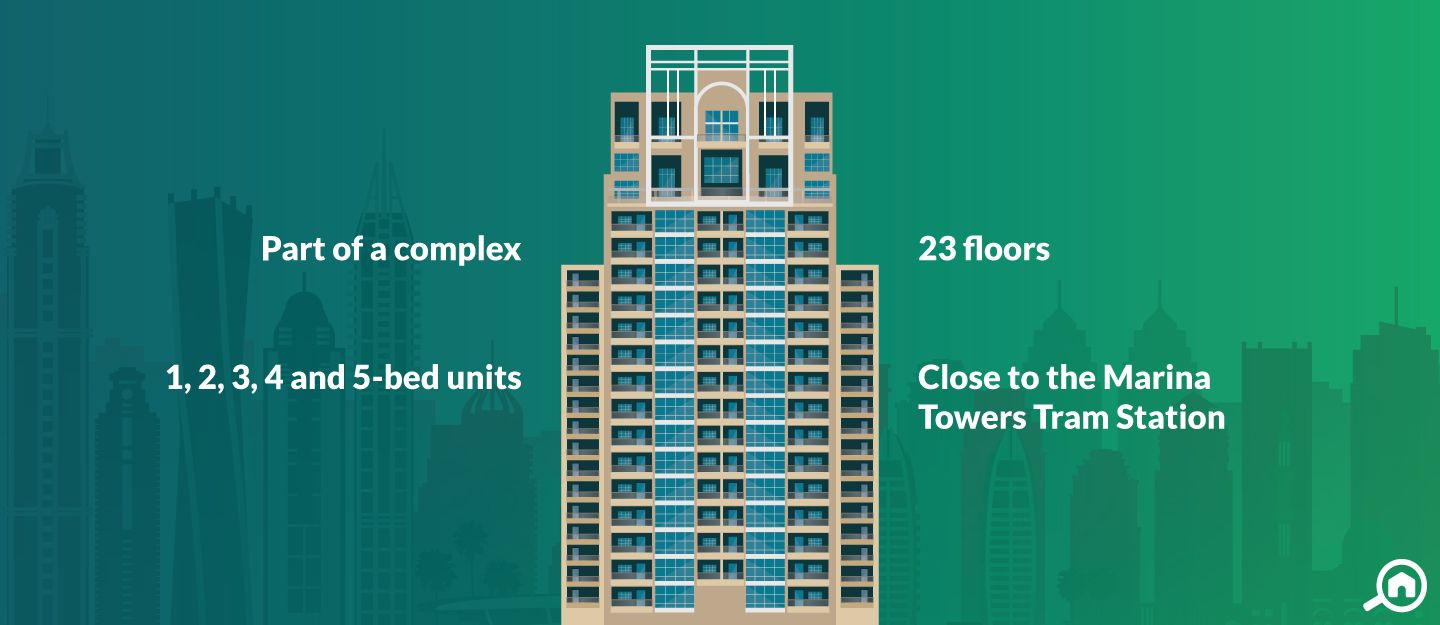 Dubai Marina Towers is a popular complex in Dubai Marina known for its luxurious apartments. The complex offers 1 to 5-bedroom apartments with 2 and 3-bedroom villas. The residence offers several amenities to its residents, including a gymnasium, swimming pool, play areas, eateries and spa facilities. The complex is just a 5-minute walk away from Marina Towers Tram station and Dubai Marina Walk.
