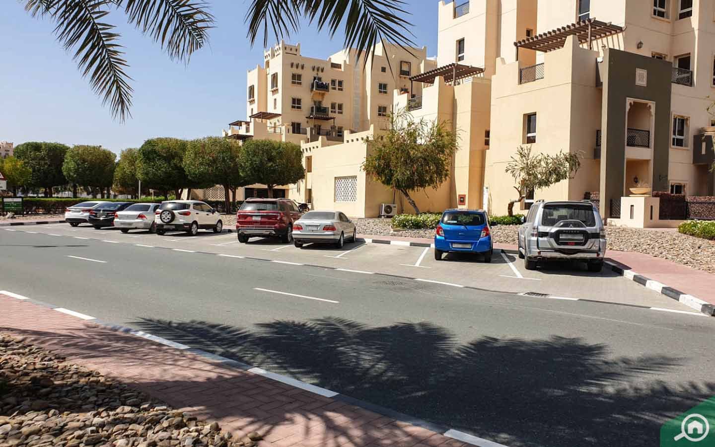 يستوعب الطابق الأرضي المخصص لمواقف السيارات 100 سيارة، ويسمح لسكان الشقق الصغيرة بصف سيارة واحدة فقط، بينما يسمح لسكان الشقق الكبيرة بصف سيارتين أو ثلاث سيارات. تجدر الإشارة إلى عدم توفر مواقف سيارات للزوار في المبنى ويتوجب عليهم صف سياراتهم في الشوارع القريبة.