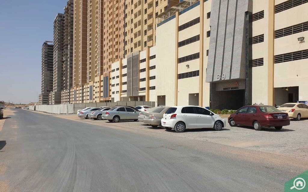 تم تخصيص الطابق الأرضي وأربعة طوابق أخرى لمواقف السيارات في برج بارادايس ليك B9.