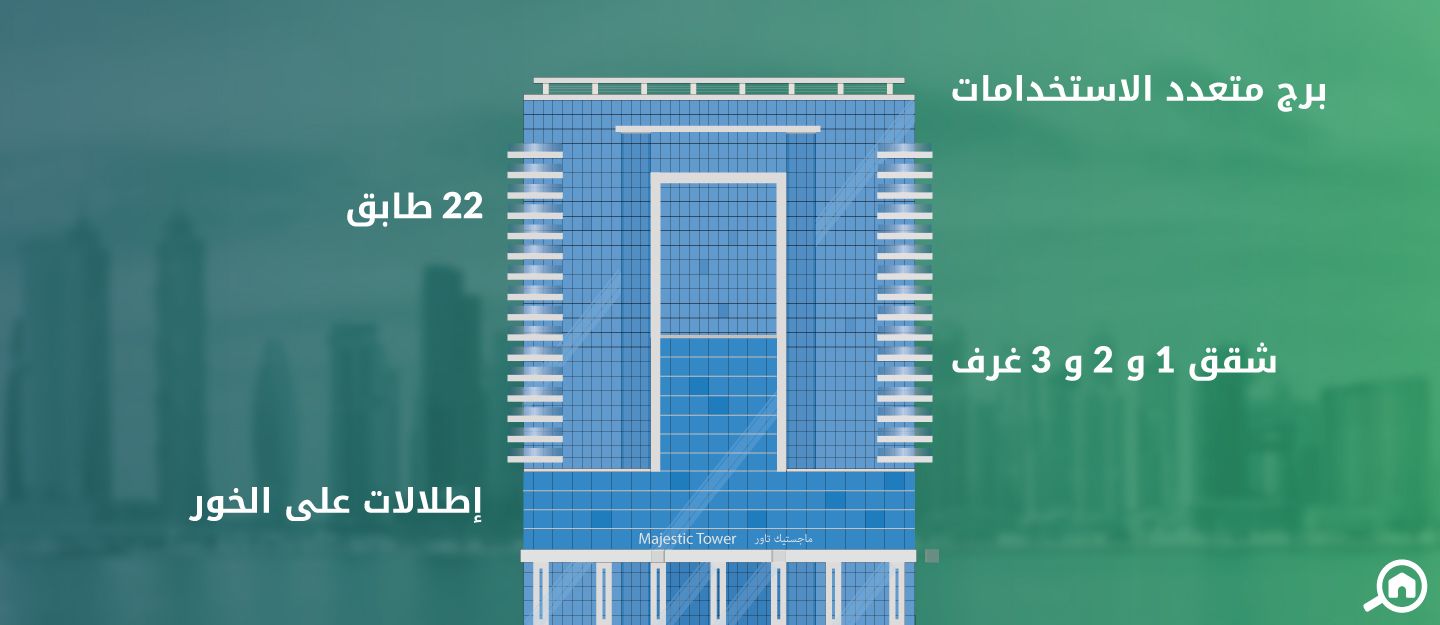 يتكون برج ماجستيك من 22 طابقاً تضم شقق غرفة وغرفتين وثلاث غرف وصالة، بالإضافة إلى مجموعة من المرافق الخدمية والترفيهية، مثل الصالة الرياضية وبركة السباحة والساونا، كما منطقة اللعب المخصصة للأطفال وغيرها من المرافق المميزة. تم تطوير البرج من قبل مجموعة الطاير للعقارات عام 2016. يحظى السكان بسهولة الوصول إلى المرافق الترفيهية والخدمية المتنوعة التي تشمل المدارس والمستشفيات، بالإضافة إلى المطاعم ومحلات السوبر ماركت والمولات وغيرها.
