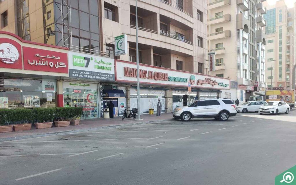 يقع سوبر ماركت مدينة القصيص في الطابق الأرضي من البرج، أما سوبر ماركت العديل وسوبر ماركت سنرايز فيقعان على بعد مسافة قصيرة جداً.