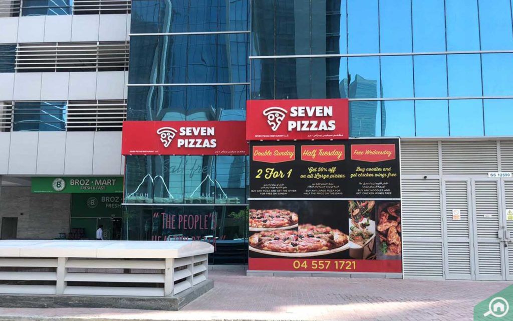 تقع مجموعة من أفضل المطاعم في منطقة الخليج التجاري على بعد مسافة قصيرة من البرج، ويذكر منها:
