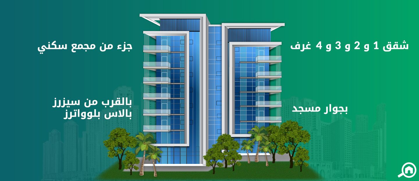 • نوع الشقق: شقق غرفة وصالة و شقق غرفتين وصالة و شقق ثلاث غرف وصالة ووحدات بنتهاوس أربع غرف