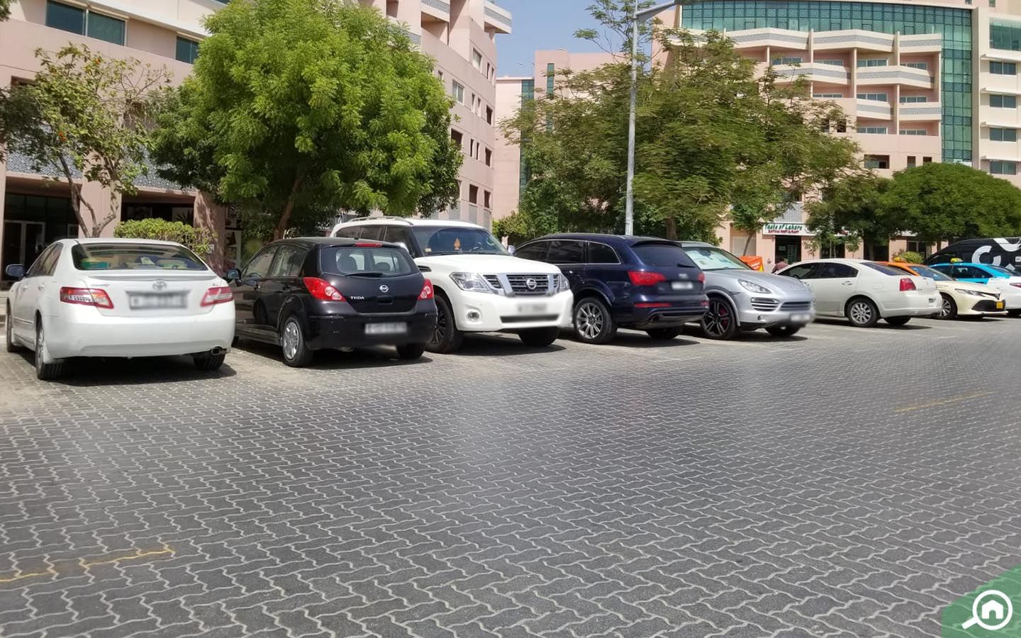تضم البناية موقفاً سفلياً يُسمح لسكان كل شقة بصف سيارة واحدة فيه على الأقل.