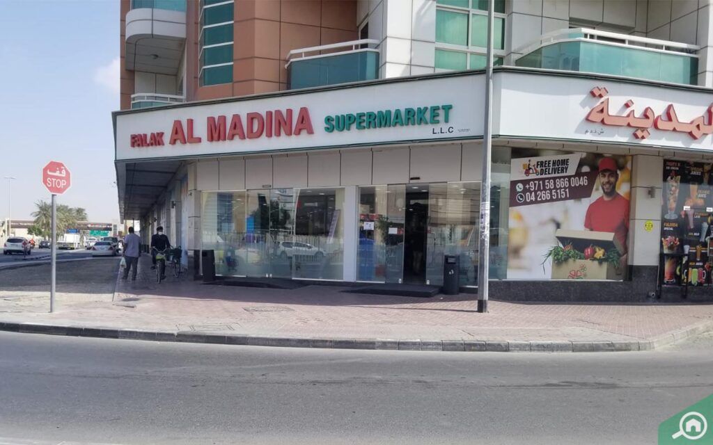 تحتضن البناية في الطابق الأرضي سوبرماركت فلك المدينة الذي يعد من أبرز متاجر ومحلات السوبرماركت في دبي.