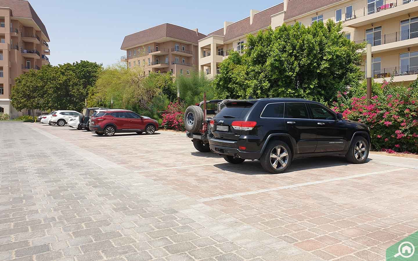 يُخصص موقف سيارات واحد على الأقل لكل شقة.