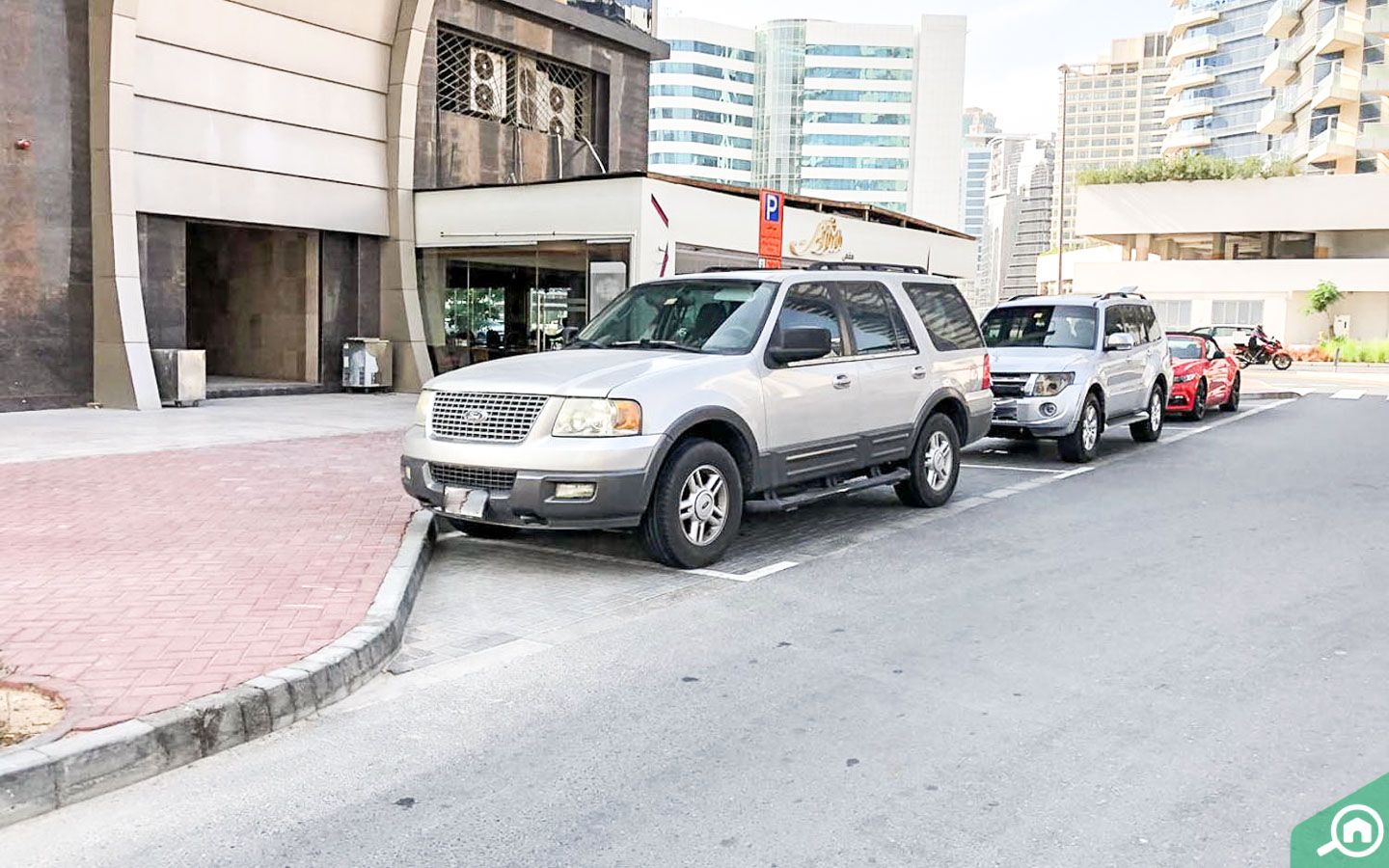 يشتمل المبنى على مواقف سيارات مغطاة، ويختلف عدد المواقف لكل شقة وفقاً لمساحتها. بينما كما تتوفر مواقف سيارات على الشارع يمكن للسكان والزوار استخدامها.