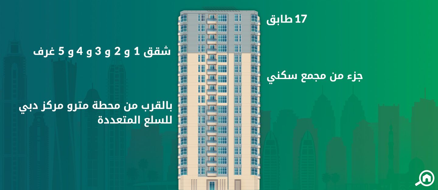 يضم المبنى 172 شقة تتنوع بين شقق غرفة وصالة و شقق غرفتين وصالة و شقق ثلاث غرف وصالة و شقق أربع غرف وصالة ووحدات بنتهاوس تتكون من خمس غرف وتتوزع في طابقين، أما بالنسبة لمرافق البناية، فإنها تشمل نادي رياضي ومسبحين.
