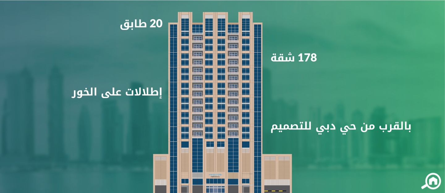 جاهز تقع مساكن هاملتون في شارع الخيل بالخليج التجاري، وتتكون من 20 طابقاً بارتفاع 88 متر، وتضم 165 وحدة سكنية. تم تصميم البرج من قبل لاكاسا للاستشارات الهندسية والمعمارية وقامت شركة ديار للتطوير العقاري بتطويره على أعلى مستوى.