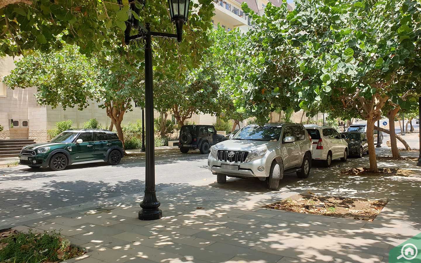 يشتمل المبنى على طابقين مخصصين لمواقف السيارات بحيث يتم تخصيص موقف سيارات واحد لكل شقة على الأقل، كما بإمكان الضيوف والزوار صف سياراتهم في الشارع.