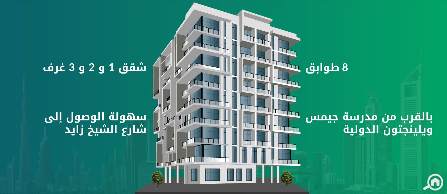 تتراوح مساحة شقق غرفة وصالة بين 820 و 900 قدم مربع، وتضم كل واحدة منها غرفة نوم مع حمام داخلي وغرفة معيشة واسعة وحمام ومطبخ مغلق ومجهز بالكامل وشرفة واسعة تطل على شارع الشيخ زايد.