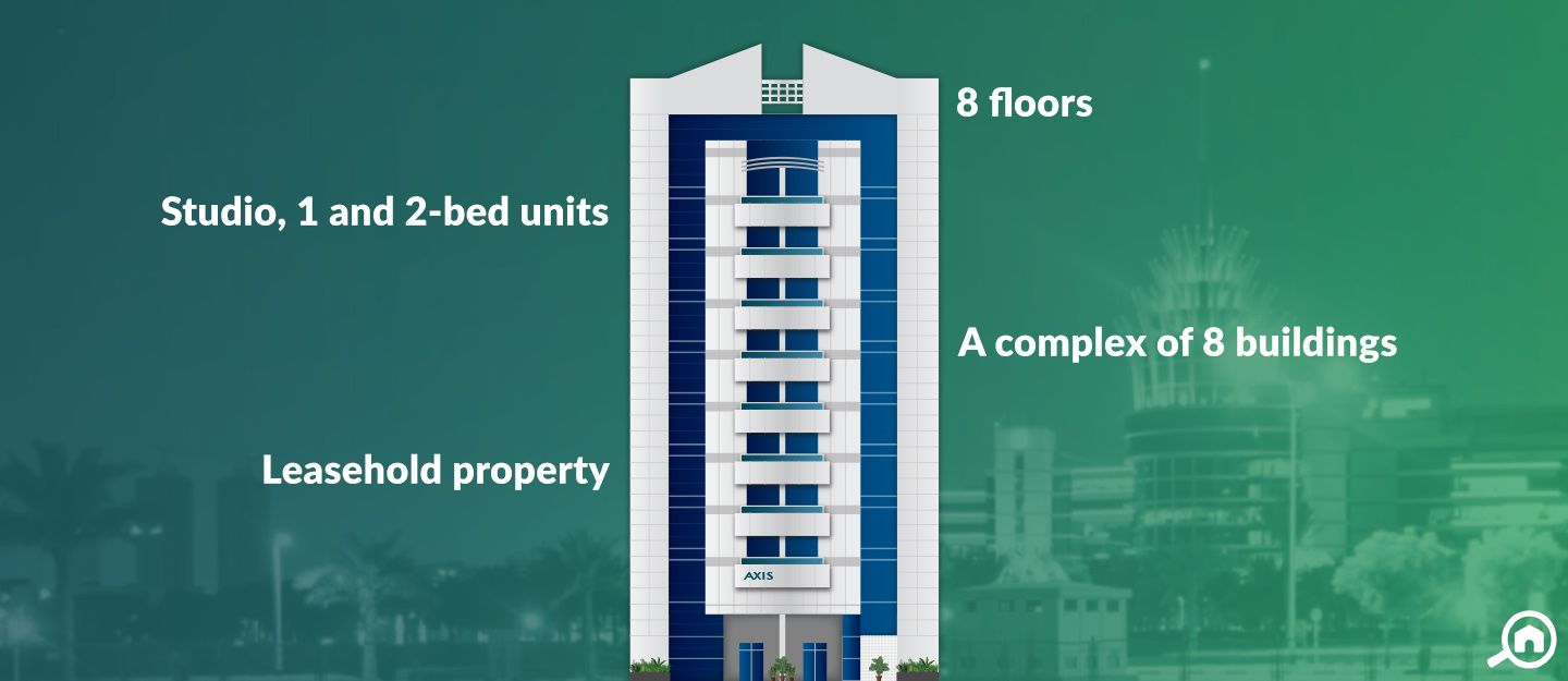 ReadyAxis Residences, Dubai Silicon Oasis is a complex featuring 8 low-rise apartment buildings. Each apartment block rises 9 floors above the ground featuring a lobby on the ground floor and residential flats on the remaining 8 floors. Moreover, each apartment gets a dedicated parking spot within the complex.