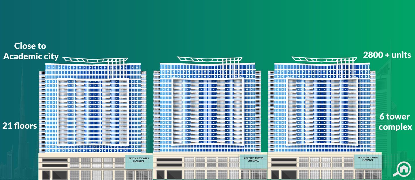 ReadySkycourts Towers is a 21-storey residential complex comprising six towers, located in Dubailand. It offers studio, 1 and 2-bedroom apartments and is located near Emirates Road and Dubai Al Ain Road, ensuring easy connectivity to the rest of the city.