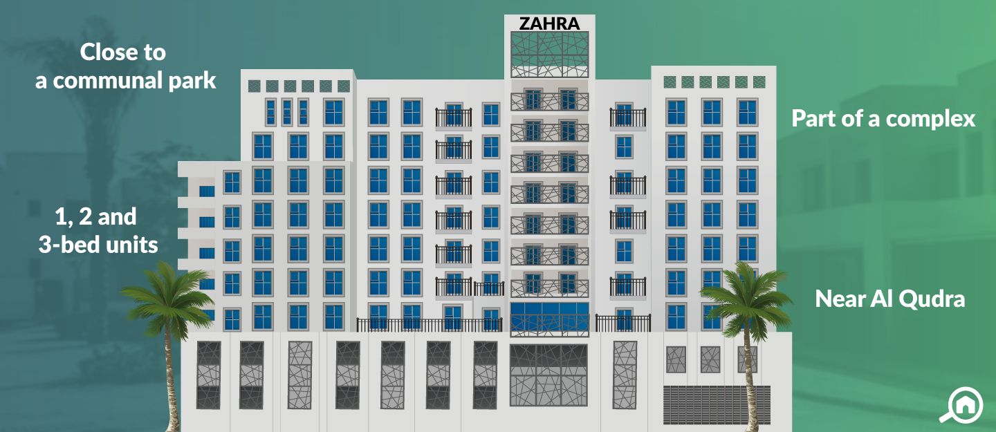 Nestled amidst lush greenery, Zahra Apartments, Town Square is an apartment complex situated at the Al Qudra Road (D63) and Emirates Road (E611) intersection.
