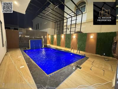 For sale in Al Zahia area, Ajman, a 4-room corner villa with a roof and a swimming pool, super deluxe finishing, freehold