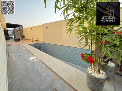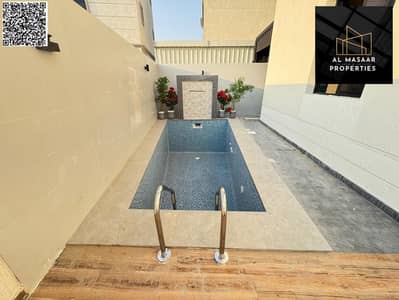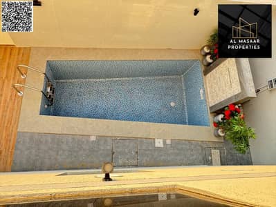 • Ground floor: Hall + Majlis with bathroom and sinks + Master bedroom + Kitchen + Storage + Maid's room with bathroom + Private washing machine area with canopy + Party seating area with canopy + Small garden + Modern swimming pool with warranty.
