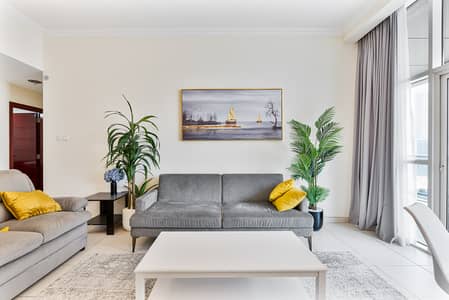 Step into a sunlit living room designed for comfort and style, featuring a plush sofa, sleek decor, and a large smart TV with Netflix. Floor-to-ceiling windows open up to the balcony, filling the space with natural light and canal views — perfect for relaxing after a day out in Dubai Marina.