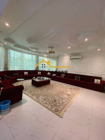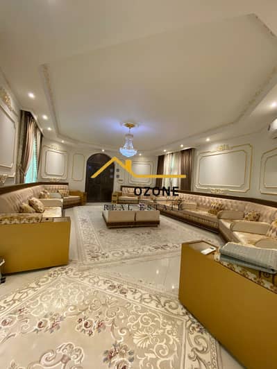 "For rent, a villa in Sharjah, Al Nouf area, single-story villa consisting of 6 master bedrooms with a majlis, and an additional external annex with 2 master bedrooms, 2 servant rooms, a driver's room, a large kitchen, and a storage room. The land area is 16,000 square feet. The rent includes furniture and is 120,000 AED, negotiable. "