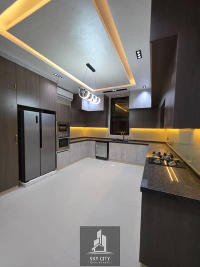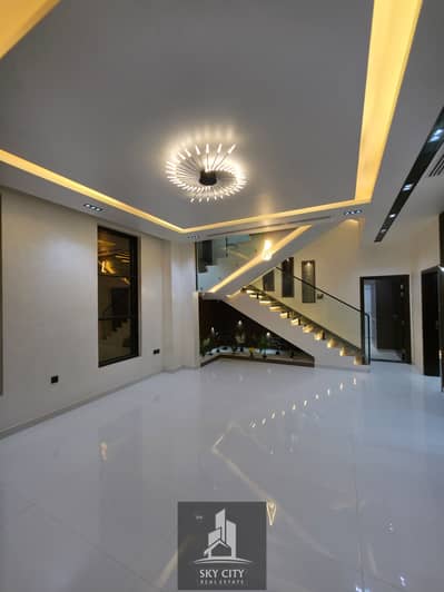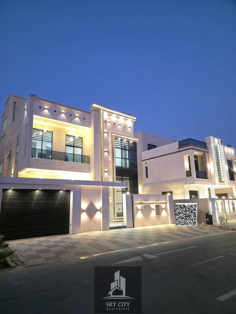 service charges, no maintenance fees. The villa is situated on a corner lot with five master bedrooms, a majlis (formal sitting room), a living room, a maid's room, a preparation kitchen, a lounge on the first floor, a large rooftop terrace, a large fully equipped kitchen, a maid's room with a bathroom, complete interior decorations, a waterfall feature, and central air conditioning with unit installation. Located on Sheikh Mohammed Bin Zayed Road, less than 20 minutes from Dubai International Airport and 14 minutes from Sharjah Airport. The villa comes with all services and amenities. Bank financing or cash is available. The asking price is AED 1,950,000, negotiable, including central air conditioning unit installation.