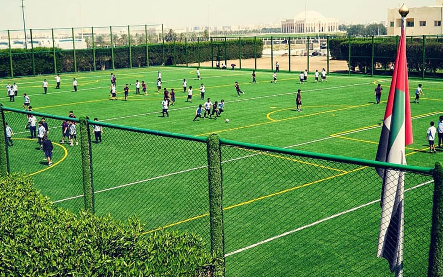 تشتهر المدرسة بتوفير حرم مدرسي حديث، حيث يعتبر من أكبر الأحرام المدرسية في دولة الإمارات العربية المتحدة، كما يضم الحرم المدرسي 5 ملاعب مخصصة للعب و3 مناطق منفصلة بيضاوية الشكل لتنظيم مختلف الأنشطة الرياضية والمسابقات والتدريبات الرياضية.