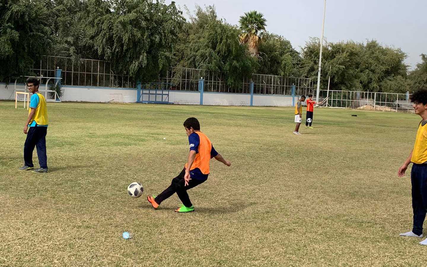 طلاب يلعبون كرة القدم في ملعب عشبي