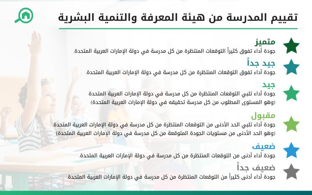 منذ تأسيسها في عام 2005، أخذت هيئة المعرفة والتنمية البشرية على عاتقها مسؤولية الارتقاء بجودة التعليم الذي تقدمه المؤسسات التعليمية في دبي، حيث يقوم مفتشو جهاز الرقابة المدرسية التابعين للهيئة بزيارات دورية للمدارس يتم من خلالها تقييمها وفقاً لمقياس مؤلف من ستة مستويات تتراوح بين تقدير “متميز” وتقدير “ضعيف جداً” كما هو موضّح أدناه:.