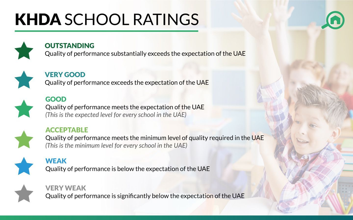 The Knowledge and Human Development Authority is a government organisation that assesses the quality of education in Dubai. KHDA is responsible for inspecting different private schools across Dubai with judgments that have been made on a six-point scale, as shown below: