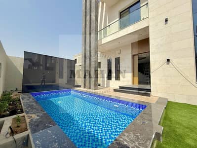 Villa for sale in Al Helio 2, Ajman, consisting of 4 master bedrooms, a living room, a main kitchen, a preparatory kitchen, a maid’s room with a full bathroom, and a swimming pool. Registration and ownership fees are included and negotiable, with a large external courtyard and an extension. front