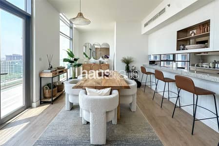 Discover luxury living at its finest with this exquisite 2-bedroom, 3-bathroom apartment situated on a high floor in the heart of Dubai Hills Estate. This premium corner unit boasts upgraded wooden floors and a tastefully designed feature wall in the living room, creating a sophisticated ambiance.